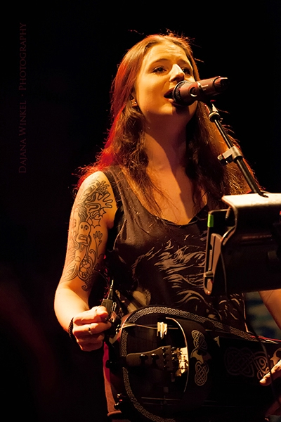 :: ANNA MURPHY :: ließ man gleichermaßen im (fast)dunklen stehen. Vielleicht muß die Zeche Carl ja enorm Strom sparen… Immerhin konnte ich mit ANNA MURPHY schon ein bißchen mehr anfangen, man kennt sie ja als Drehleier-Spielerin und Backgroundsängerin von Eluveitie. Aber es scheint, ANNA MURPHY ist in letzter Zeit auch solo recht umtriebig, wie z.B. in Lethe oder Nucleus Torn. Oder eben mit ihrer eigenen Band (u.a. mit Eluveities Merlin Sutter an den Drums und Rafael Salzmann an der Gitarre), um ihr jüngst in Eigenregie produziertes und veröffentlichtes Soloalbum Cellar Darling zu promoten, das im Übrigen überhaupt nichts mit Metal zu tun hat. Ihre Stimme fand ich überraschend ausdrucksstark und variabel, musikalisch deckt sie ein großes Spektrum ab, paßt somit in keine Schublade. Fand ich generell toll, aber es fehlte auch hier das letzte Quäntchen Überzeugungskraft in ihrer Performance. Ich würde ANNA MURPHY aber schon eine großartige Solokarriere prophezeien wollen.